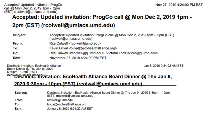 The former vice-President of ECO-Health Andrew Huff is bonkers or pretending to be: "For the past 2 months I have been under constant surveillance in all forms, my house has been broken into, hard drives have been stolen, electronic eavesdropping equipment has been installed throughout my home, all my electronic devices have been hacked with drones, culminating with being attacked in my house with microwaves from an aircraft."