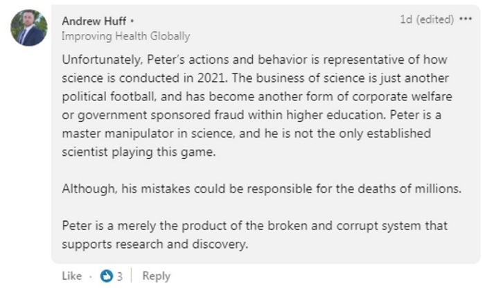 Daszak tried to cover up the lab leak theory by orchestrating a letter from various micro-biologists, many of whom were on Fauci's grant pad, that did not contain his name. The claimed the virus spilled over from nature. Daszak also became a fact-checker at Facebook, which permanently banned this researcher from advertising.