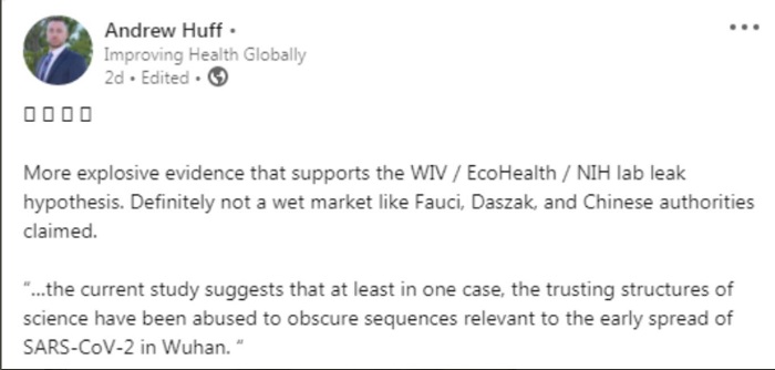 The former vice-President of ECO-Health Andrew Huff is bonkers or pretending to be: "For the past 2 months I have been under constant surveillance in all forms, my house has been broken into, hard drives have been stolen, electronic eavesdropping equipment has been installed throughout my home, all my electronic devices have been hacked with drones, culminating with being attacked in my house with microwaves from an aircraft."